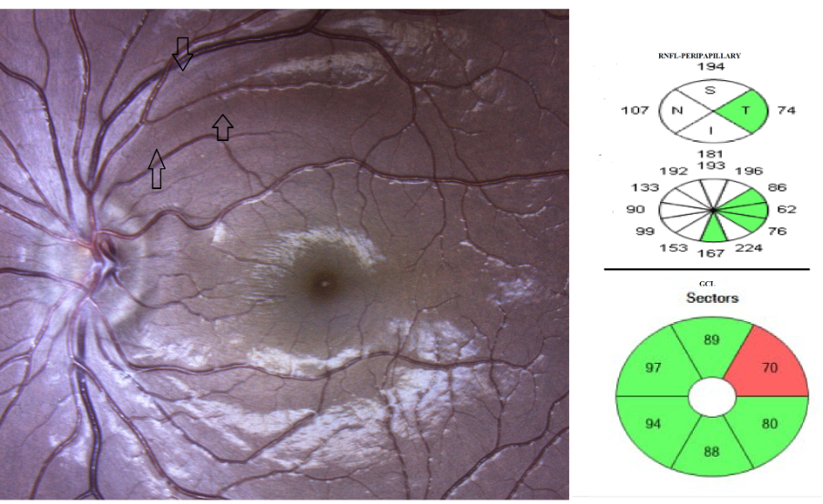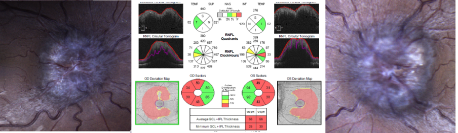 This is best done using a ganglion cell layer (GCL) analysis, as it can directly provide the axonal loss. GCL thickness may be normal in early papilledema and is found to decrease in chronicity. A decrease in peripapillary RNFL thickness can be due to decrease in edema or axonal loss or both. On the other hand, GCL analysis reflects the axonal loss and correlates with optic disc pallor. [4,5] As seen in the image below, there can be a GCL thinning in both papilledema and pseudopapilledema and thus cannot be used to differentiate the two.