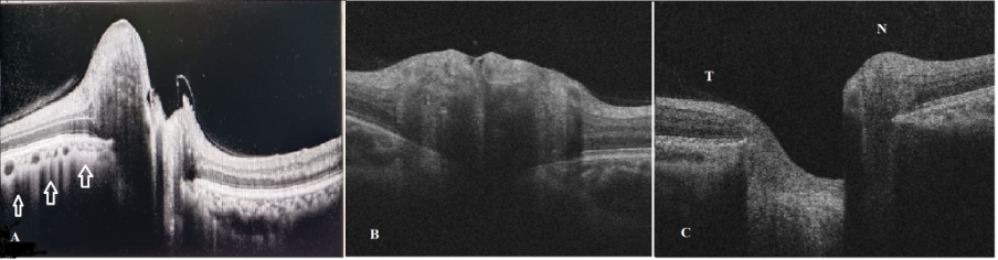 Transverse OCT scan through the optic nerve head can help us understand the morphology of the disc with respect to the Bruch’s membrane layer. Increase in intracranial pressure will lead to anterior bowing of the Bruch’s membrane layer, which has a V-shaped or flat configuration in normal population. The morphologies described in papilledema are W, S, and dome-shaped.[5] EDI-OCT (enhanced depth imaging OCT) has been found to have the highest sensitivity to detect optic disc drusen. It is seen as a hyporeflective mass with hyper-reflective borders suggestive of a buried disc drusen.