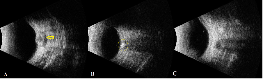 The crescent sign is seen as a hypoechoic shadow within the optic nerve shadow on B-scan and is due to accumulation of fluid in the perineural space, with a sensitivity as good as 92%. [11] However, it may fail in distinguishing true disc edema from optic disc drusen as around only 55% of patients may demonstrate a hyperechoic lesion.[8] When it comes to optic disc drusen (ODD), B-scan reveals a hyperechoic shadow at the optic nerve head with posterior shadowing as shown in Fig 5B.